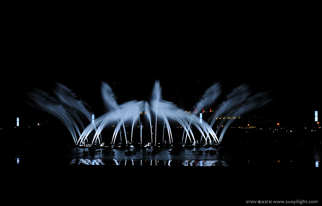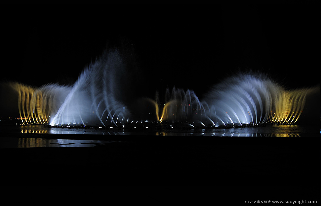 喷泉周围安装了四组超大音响,背景音乐分为古典、民乐和歌曲三大类型,采用高保真、远射程专业音响系统,使喷泉声、光、水、色有机交融。每当夜幕降临,水声、音乐声、涛声与变幻的激光彩灯融为一体,气势磅礴,身临其境,如人间琼台。